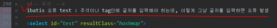 2. 원인 : ibatis에 (tag나 주석처리 없이) 그냥 글자를 입력함