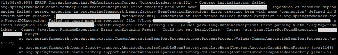 org.springframework.beans.factory.BeanCreationException: Error creating bean with name '***': Injection of resource depend encies failed; nested exception is org.springframework.beans.factory.BeanCreationException: Error creating bean with name 'connection' defined in S ervletContext resource [***-datasource.xml]: Invocation of init method failed; nested exception is org.springframework.cor e.NestedIOException: Failed to parse mapping resource: file [***.xml]; n ested exception is com.ibatis.common.xml.NodeletException: Error parsing XML. Cause: java.lang.RuntimeException: Error parsing XPath '/***'. Cause: java.lang.RuntimeException: Error configuring Result. Could not set ResultClass. Cause: java.lang.ClassNotFoundException: ***.***VO