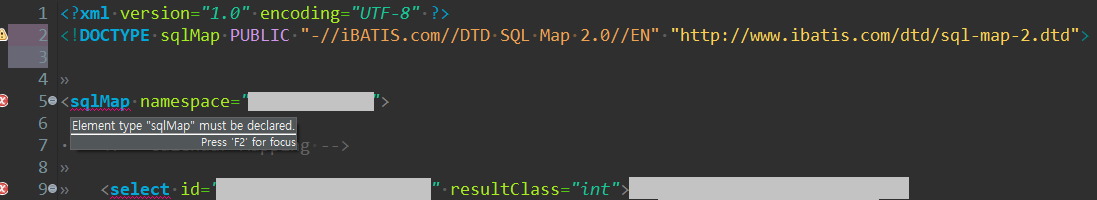 오류 메세지 : Element type "sqlMap" must be declared