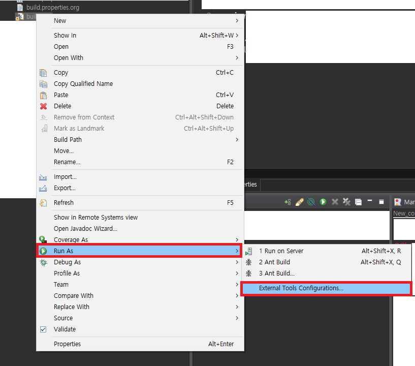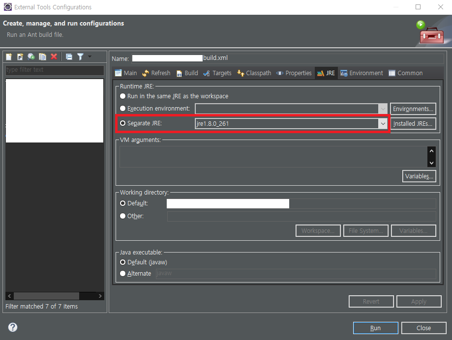 2. 해결방법 : build.xml 우클릭 >Run As > External ToolsConfiqurations> JRE 탭 > Separate JRE > jrd 1.8.0 로 선택